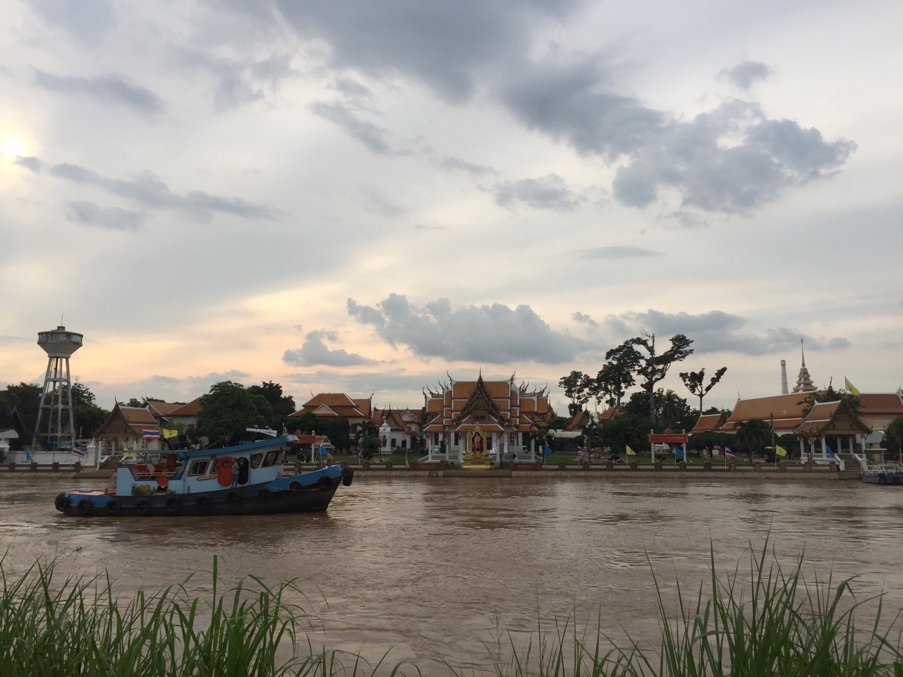 The river around Ayutthaya is used by barges and tug boats transporting goods. I stopped at a particular section where two rivers meet with opposite currents conflicting one another. There was a floating ferry dock where the ferry boat would pull all the way up within the big blooming water hyacinths and wait for sailors as the plants packed him permanently into the dock. The currents sent smaller boats spinning and twirling uncontrollably toward a temple that stood at the fork where the two rivers met. I watched in amazement as two tugboat drivers, attached to opposite ends of three large barges, would maneuver the current. The front driver would launch the barges into the river-fork as the second tug backpedaled at maximum capacity to make sure the barges wouldn’t slam the banks. Then, as the barges quickly approached the temple, both tugboats flipped around to tug upstream. In the nick of time, the barges were straightened and no longer headed for eminent destruction of the temple. You could see the captains relax as they continued downstream.