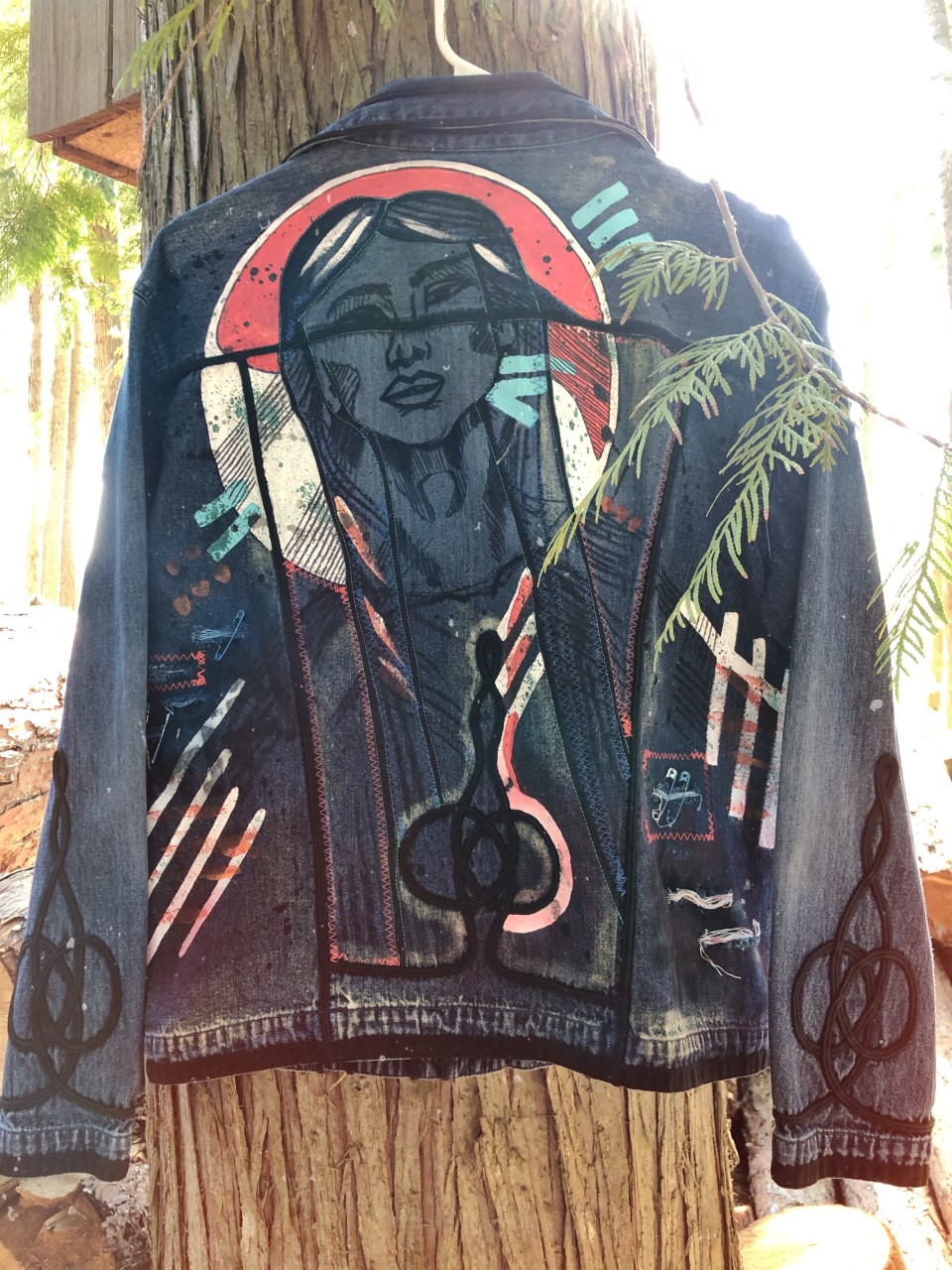 This is a MIXED MEDIA jacket. Bleached, sharpie’d, painted, distressed/ripped, dyed, splattered with India Ink, and machine embroidered with thread work.