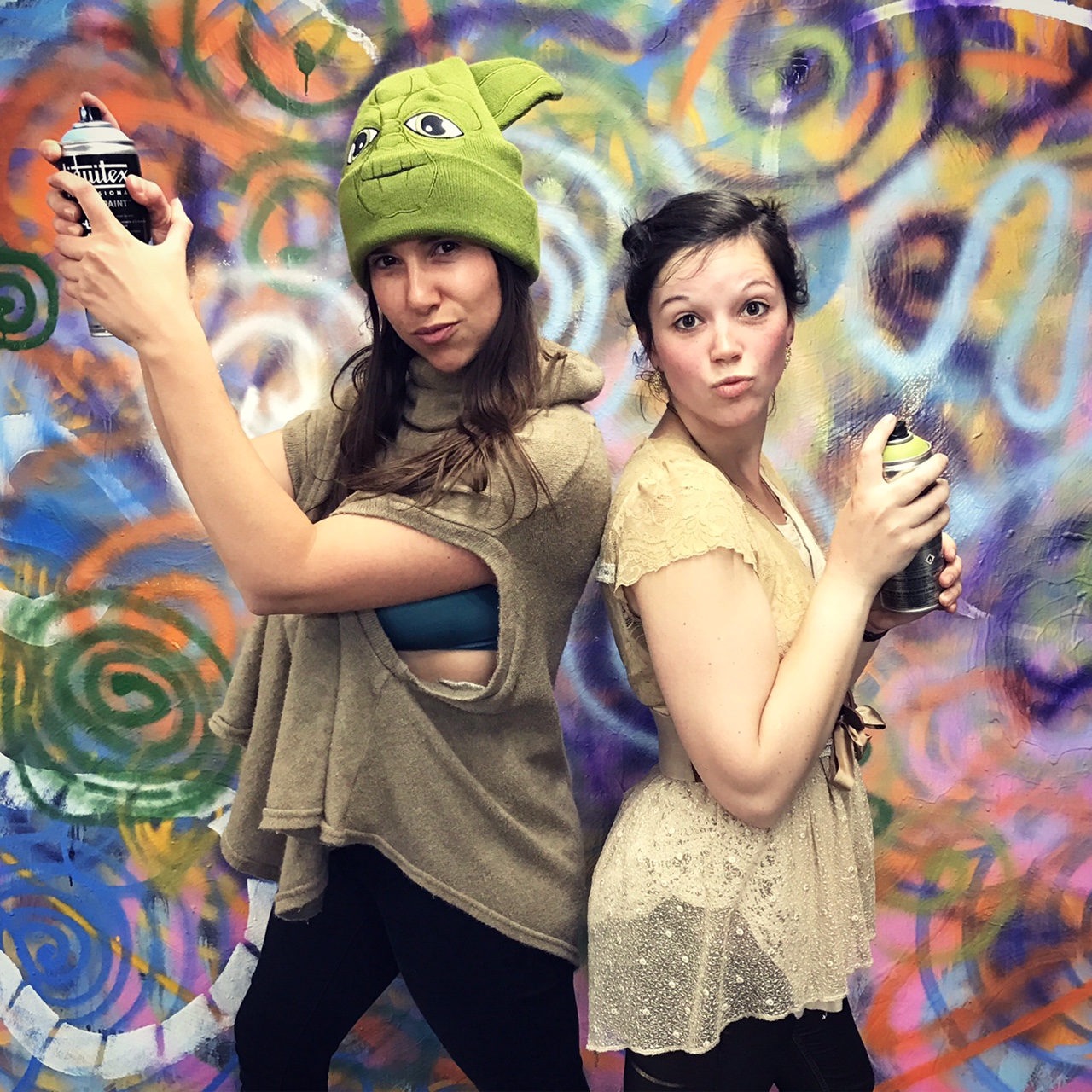 My roommate is currently between jobs, so she had the whole day to spend designing a Princess Leia outfit so we could rep “the light side” (even though it’s never referred to as that… like what the heck IS the good side called?!), together. Her costume was perfect, composed of glittery gold leggings and a layered linen top. She also prepped a more appropriate outfit for me to wear with my Yoda hat, so I wouldn’t look like such a phony poser. It was literally 1,000 degrees when I got off work, so wearing a beanie was quite complicated. I decided to leave my car in the employee parking lot because I figured I’d Uber back to work on Friday morning (as is usual the day after first Thursdays). We met up with the other Thursday troopers at Boise Creative Center, where they were having a “free spray-painting event.” I used their hot sweaty studio bathroom to change into my Yoda robes. We left BCC pretty quickly because we were only allowed to spray-paint spirals on the large-format canvas, so we didn’t feel very creative for being at a creative center.